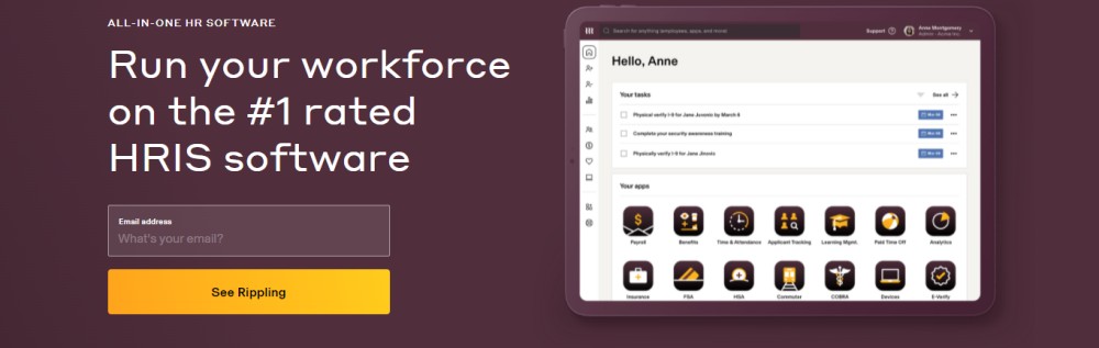 Rippling 是一款用于人力资源和薪资解决方案的一体化软件,可在一个地方管理和自动化从入职到介于两者之间的所有操作的所有操作。 它为您提供易于使用的 HRIS 和高级功能,例如满足您公司需求的定制,以及与 Office365、Slack 等 500 多个应用程序的集成,让您的工作更轻松。