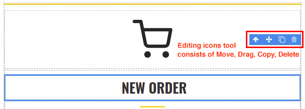 将鼠标悬停在每个元素上,您可以看到图标(移动 -> 文本 -> 列 -> 部分 -> 另一个部分)/拖放/复制/删除,如下所示。