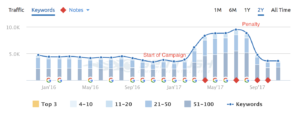 要查看可疑 SEO 策略效果的示例,请查看下图。 我们之前的一个潜在客户决定与一家基于绩效的机构合作,虽然他们看到了快速增长,但随后的谷歌更新将他们的关键字排名降至两年来的最低水平。