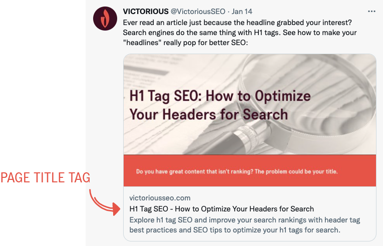 例如,我们的 Twitter 帖子链接到一篇关于 h1 标签 SEO 的文章,其页面标题显示为“H1 标签 SEO – 如何优化您的搜索标题”。