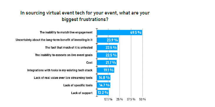 由于参展商/与会者期望的多样性和潜在的不匹配,在线活动的制作者一直在努力满足网络的期望也就不足为奇了。 在《虚拟活动技术指南》中接受调查的制作人中有 50% 表示,他们对虚拟活动的最大挫败感与面对面活动提供的参与度相当。