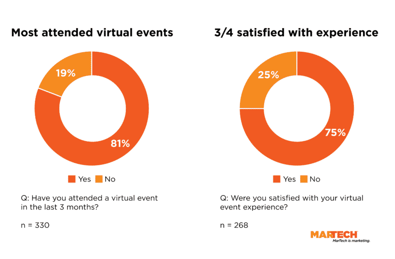 同时,虚拟活动的参与度以及对它们的满意度很高。 对活动参与指数调查作出回应的营销人员中有 81% 表示他们在过去三个月中参加了虚拟活动,四分之三的人表示他们对体验感到满意。 (编者注:受访者是自选参与本次调查的营销人员。其他行业和人群的结果可能有所不同。)