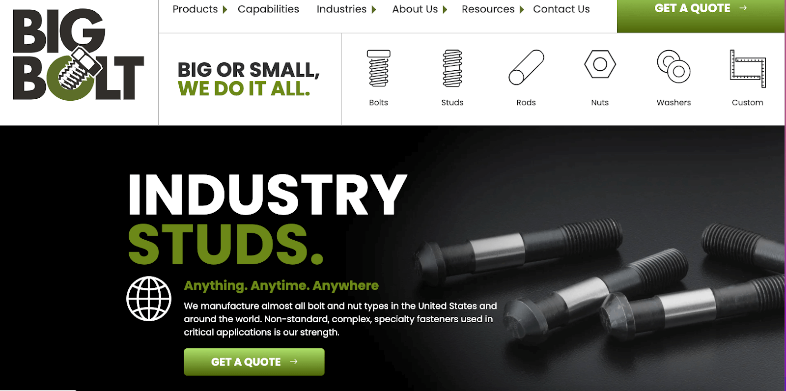大而大胆的排版是一个强有力的声明。 Big Bolt 网站完美地说明了这一点。 这种网站设计趋势对制造商特别有吸引力,但它几乎适用于任何行业。