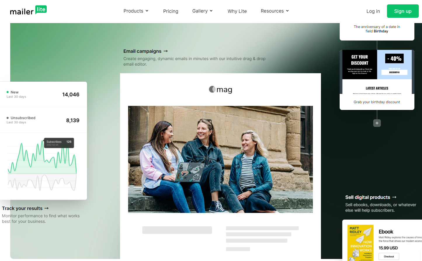 MailerLite 非常適合初學者,提供經典的電子郵件自動化功能。 它特別適合個體企業家或小型企業。
