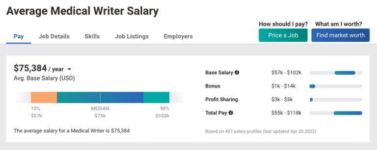 根據 Payscale,醫學作家的平均年薪約為 75,384 美元。