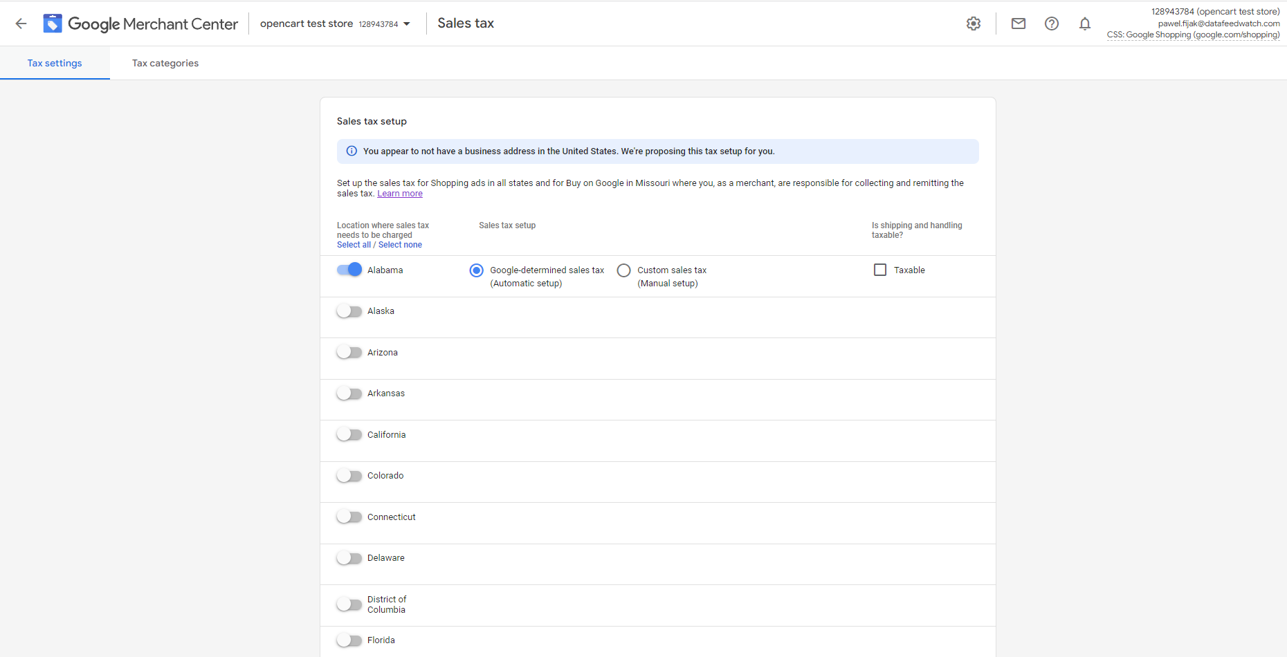 設置稅金的最佳且最簡單的方法是使用您的 Google Merchant Center 帳戶中的稅金設置。 您可以在那裡設置每個州的稅率。 您還可以通過在商品 Feed 中添加 [tax] 屬性來指定稅率 - 這將覆蓋 Merchant Center 中設置的每種商品的稅費。