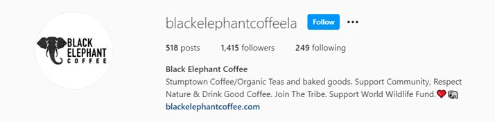 看看這個來自 Black Elephant Coffee 的 Instagram 業務簡介。 該公司的簡歷提供了對業務和品牌價值的精確洞察。