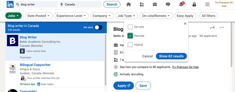 上傳後,使用搜索欄搜索職位名稱,然後添加特定位置或“遠程”或“自由職業者”之類的內容以獲得更大的演出池。