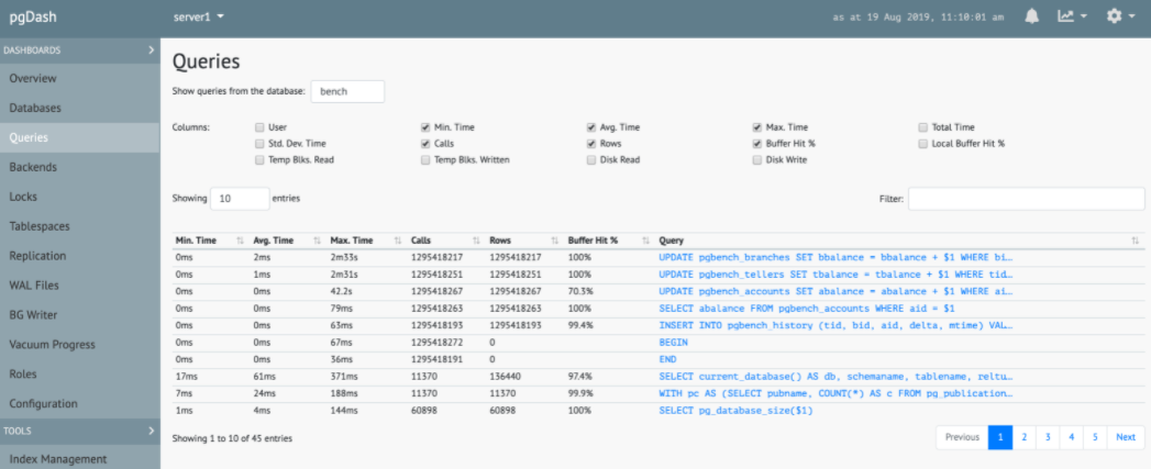 它還具有出色的數據庫可視化功能,可以輕鬆監控大型數據庫。 它還提供 14 天的歷史數據。 Pganalyze 提供 15 天免費試用,之後每台服務器 149 美元。