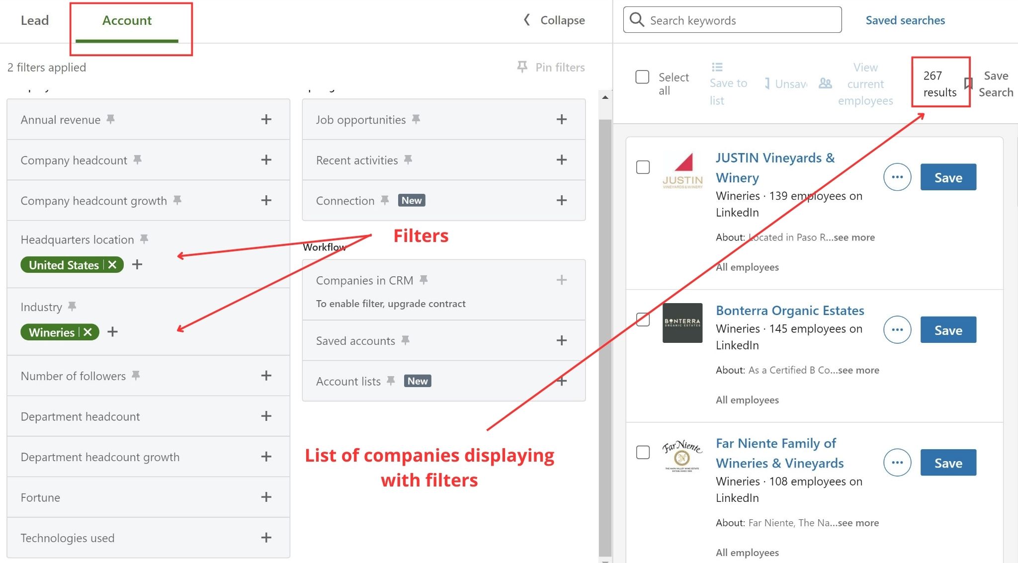 LinkedIn Sales Navigator的工作方式有點不同。 要搜索公司,您需要轉到帳戶選項卡。