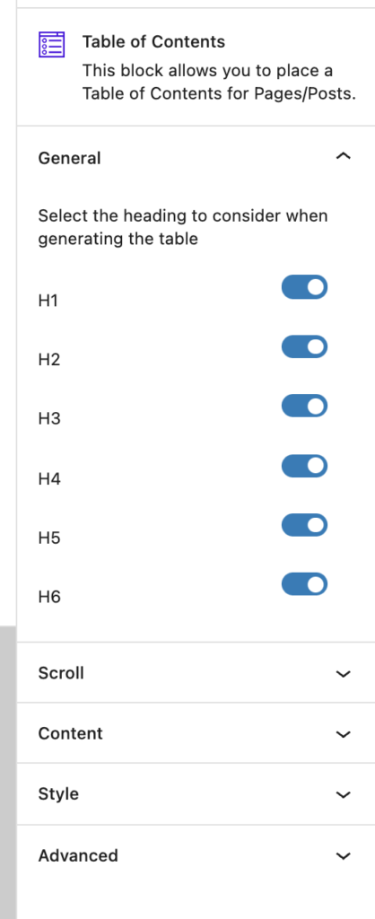 您必須選中內容末尾的框以啟用目錄選項,因為它不會自動生成它。 您可以使用不同的字段來管理目錄頁面的六個級別。 在每個級別,您都可以分配一個類或自定義 ID,選擇字體大小並添加正確的標題標籤。