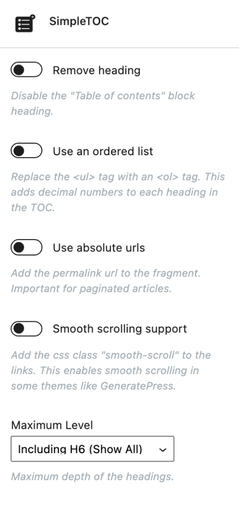 這是 SimpleTOC 塊設置選項的屏幕截圖: